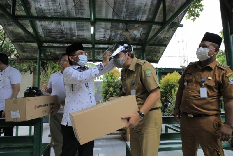 Pendistribusian masker diawali dengan penyerahan face shield secara simbolis oleh Wakil Walikota Tangerang, Sachrudin, kepada 13 camat se-Kota Tangerang di ruang terbuka hijau kantor Kecamatan Pinang, pada Jumat (13/11/2020).