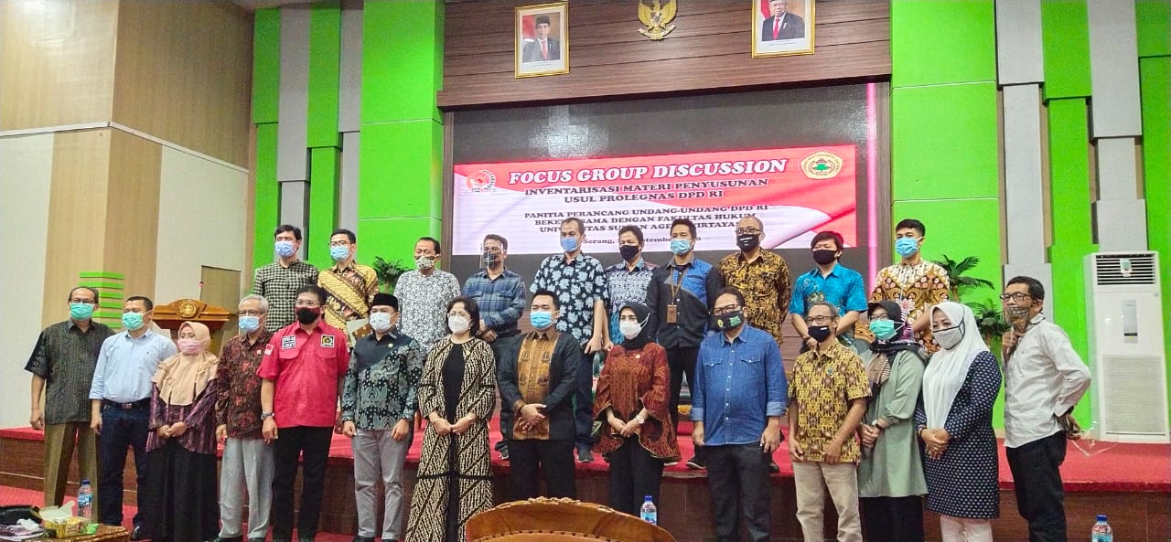 SERANG – Panitia Perancang Undang-Undang (PPUU) DPD RI melaksanakan diskusi terbatas di Auditorium Universitas Sultan Ageng Tirtayasa (Untirta), di Kota Serang, Kamis (24/9/2020). Tujuannya, dalam rangka Penyusunan Prolegnas Prioritas Tahun 2021.