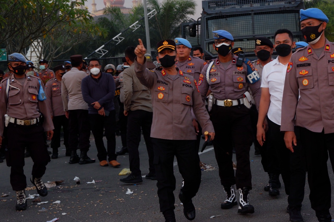 “Masa aksi melakukan orasi di luar pagar dengan menggunakan mobil komando situasi sempat memanas namun dapat dikendalikan dengan tindakan persuasip oleh kepolisian,” jelas AKBP Maruli Hutapea.