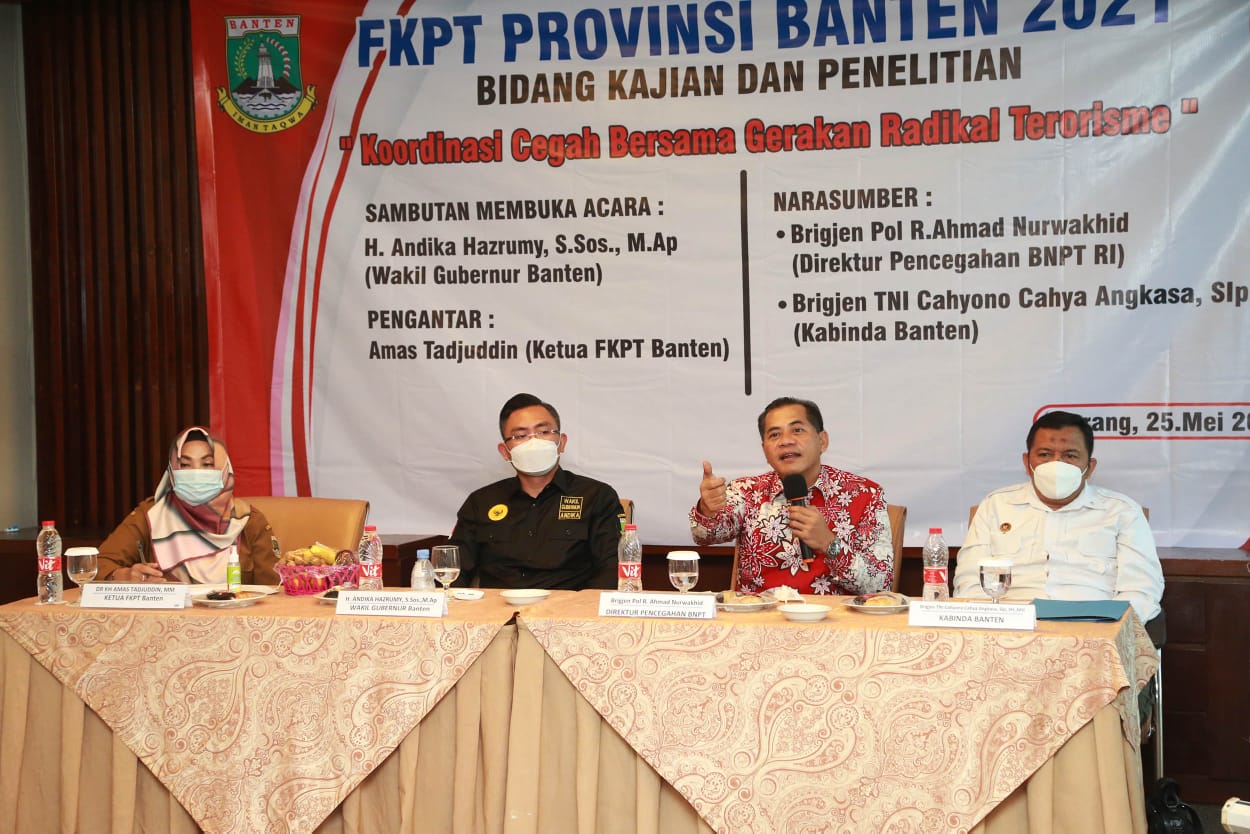 SERANG – Wakil Gubernur Banten Andika Hazrumy meminta Forum Koordinasi Pencegahan Terorisme (FKPT) Banten mewaspadai penyebaran paham radikalisme dan terorisme di media sosial. Menurutnya, Pemprov Banten berharap agar FKPT Banten menggunakan pendekatan berbasis teknologi informasi dalam mengantisipasi dan mendeteksi infiltrasi gerakan radikal dan terorisme khususnya di media sosial.