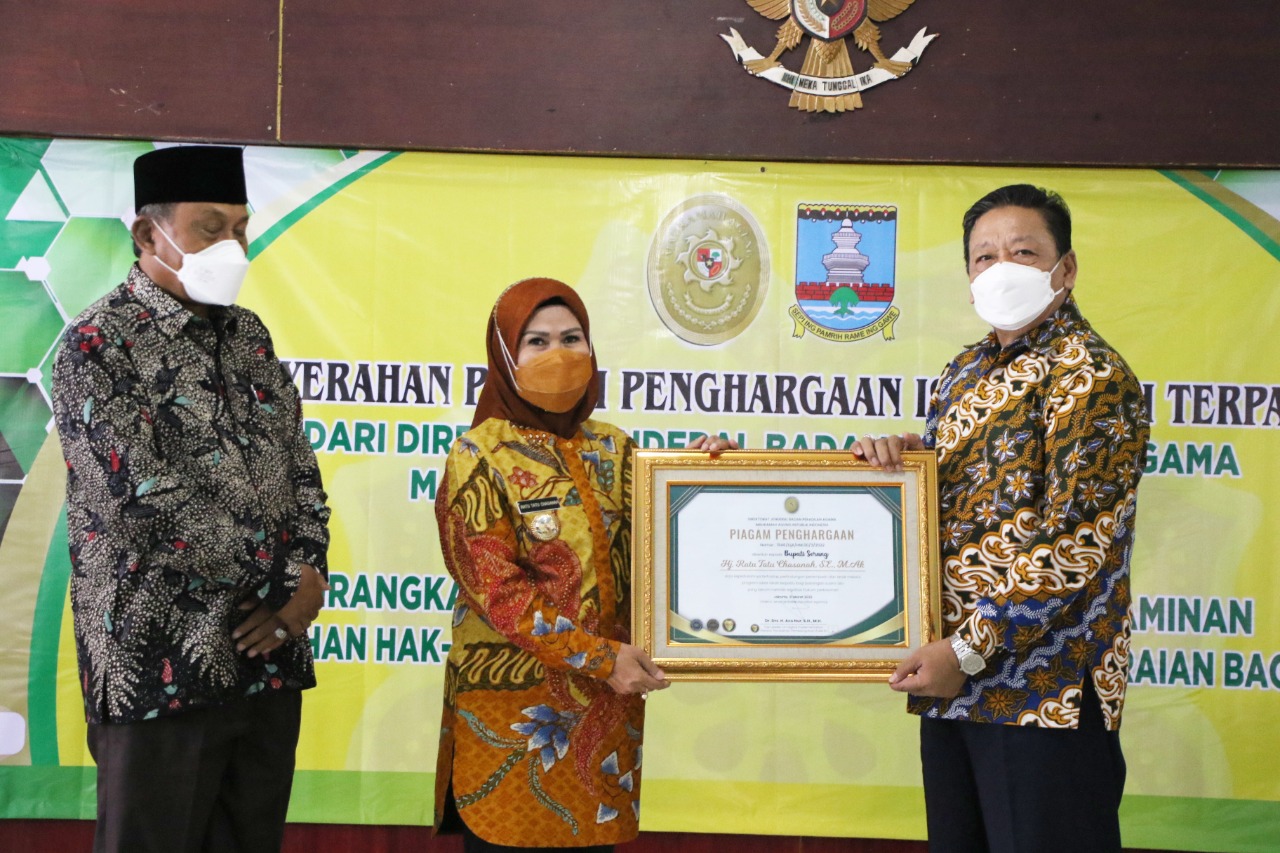 SERANG – Bupati Serang Ratu Tatu Chasanah meraih penghargaan dari Direktorat Jendral (Ditjen) Badan Peradilan Agama (Badilag) Mahkamah Agung (MA) Republik Indonesia. Apresiasi diserahkan oleh Direktur Jendral (Dirjen) Badilag Aco Nur, di Aula Tubagus Suwandi Setda Kabupaten Serang pada Kamis (7/4/2022).