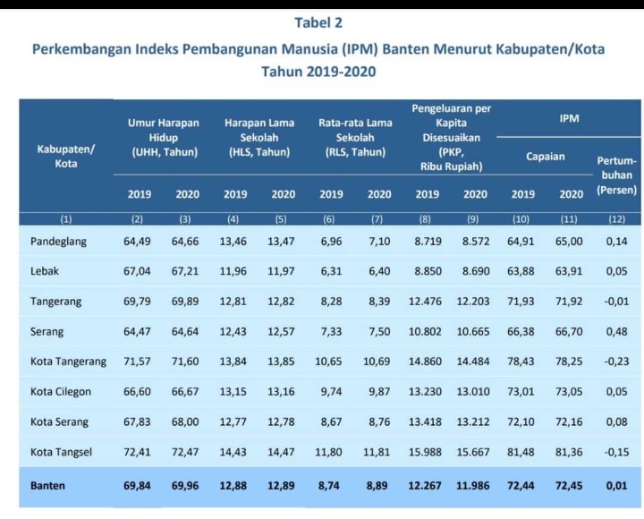 SERANG – Badan Pusat Statistik (BPS) merilis perkembangan Indeks Pembangunan Manusia (IPM) Provinsi Banten dan delapan kabupaten/kota tahun 2020. Kabupaten Serang menjadi daerah tertinggi dalam pertumbuhan IPM di Provinsi Banten.